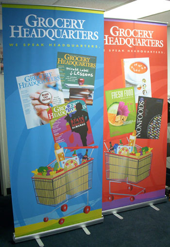 - Printed Banners with Banner Stand - These banners are printed on a matte finish material or on fabrics that accept ink beautifully and will not give you trouble with glare. We can provide hangers for suspending the banner from the pole at the back of your booth, or put grommets in the top and give you S hooks that will go over the pole. We also stock retractable, and X banner stands. Banners are easy to transport.